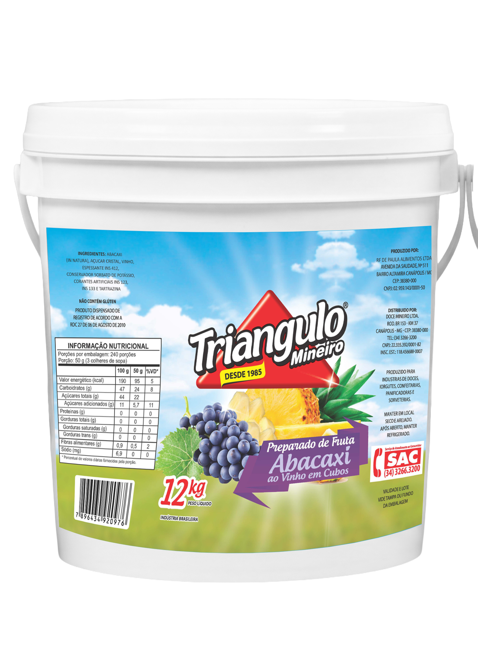 Composição: Abacaxi in natura, açúcar cristal, vinho, espessante INS 412, conservador sorbato de potássio, Corante artificial INS 102, INS 133 e INS 123.
